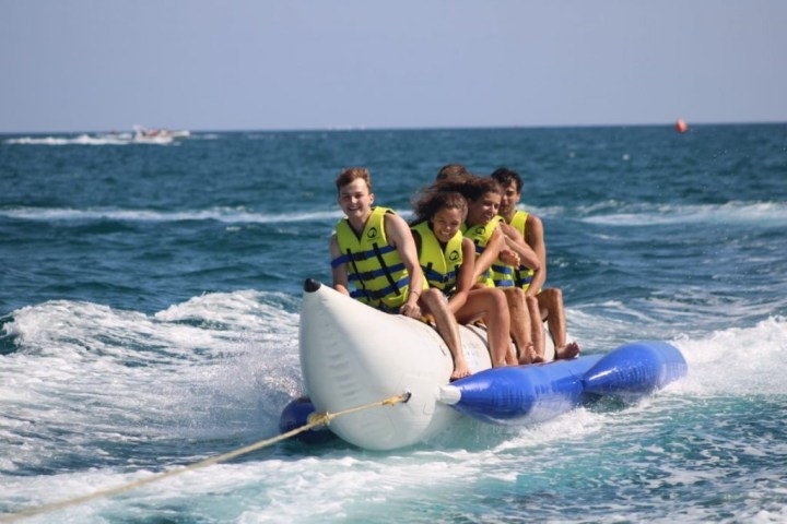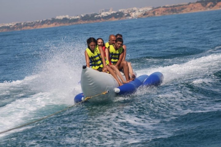 Montez à bord d’un bateau banane pouvant accueillir jusqu’à 6 personnes, accrochez-vous bien et amusez-vous avec vos amis en glissant sur les eaux cristallines au large de la côte d’Albufeira.